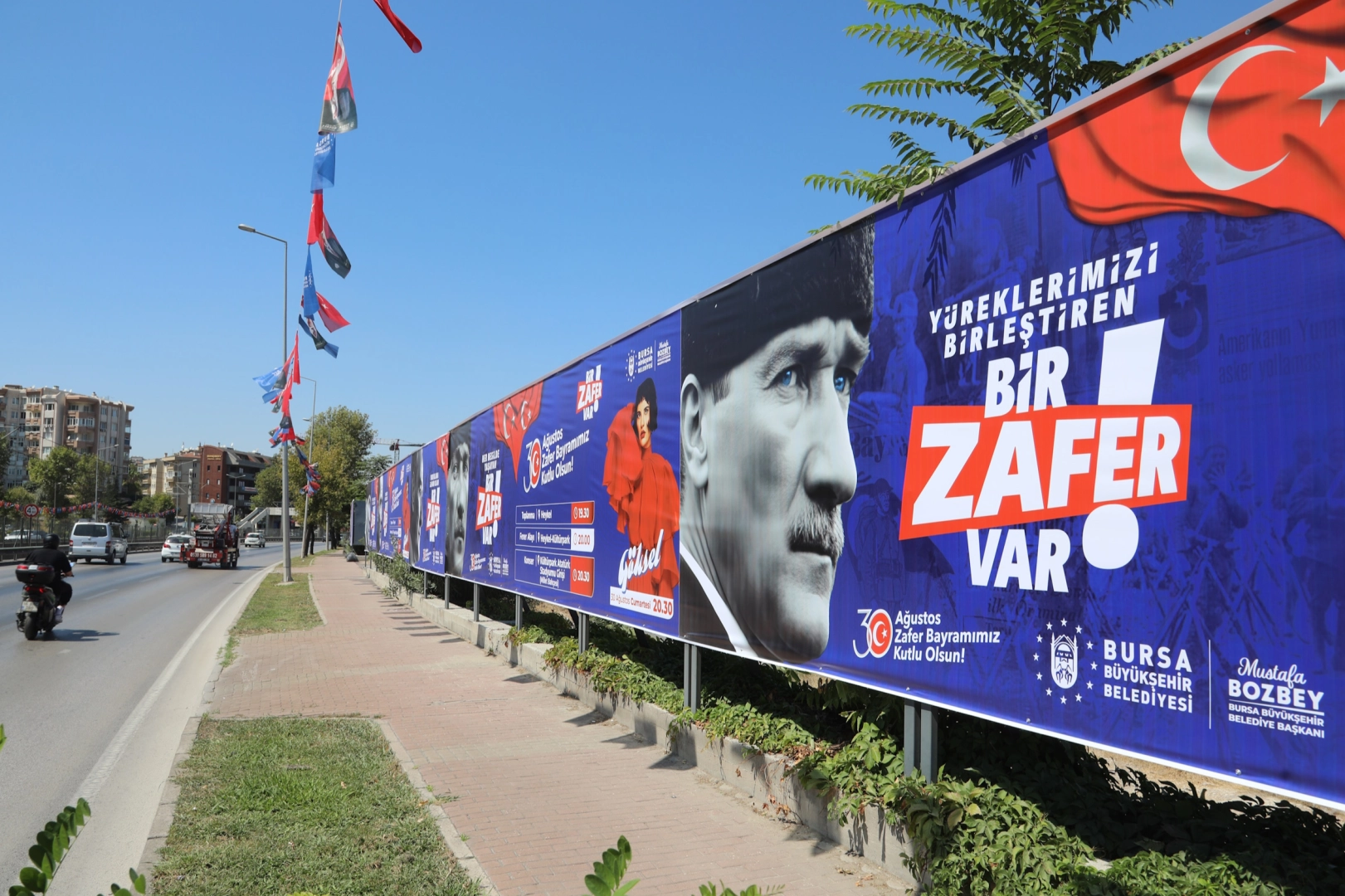 Bursa Büyükşehir Belediyesi, 30 Ağuston Zafer Bayramı öncesinde kentin dört bir tarafını ‘Bir Zafer Var’ temalı afiş ve billboardlarla donatarak 7’den 70’e herkese Büyük Zafer’in coşkusunu yaşatıyor.