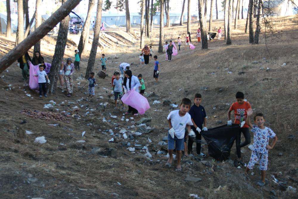 Mimar Sinan Mahallesi'ndeki konteyner kentte bir araya gelen gönüllüler ve çocuklar konteyner kentin çevresindeki ağaçlık alanda biriken çöpleri topladı.