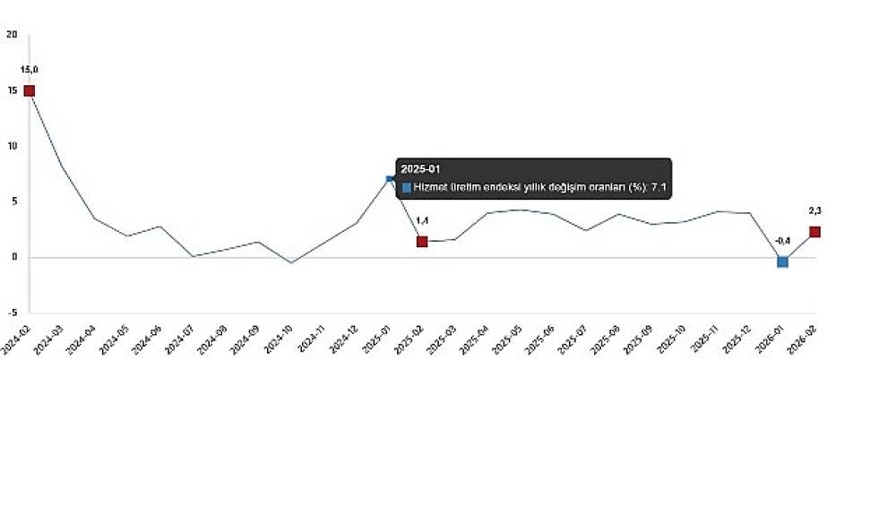 Hizmet üretim endeksi (2021=100) 2026 yılı Şubat ayında bir önceki yılın aynı ayına göre %2,3 arttı. Aynı ayda ulaştırma ve depolama hizmetleri %0,3 azaldı, konaklama ve yiyecek hizmetleri %3,5 arttı, bilgi ve iletişim hizmetleri %13,3 arttı, gayrimenkul hizmetleri %8,7 azaldı, mesleki, bilimsel ve teknik hizmetler %5,6 arttı, idari ve destek hizmetleri ise %1,4 arttı.