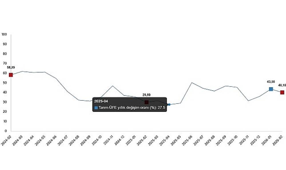 Tarım-ÜFE'de (2020=100), 2026 yılı Şubat ayında bir önceki aya göre %0,21 artış, bir önceki yılın Aralık ayına göre %8,69 artış, bir önceki yılın aynı ayına göre %40,10 artış ve on iki aylık ortalamalara göre %38,97 artış gerçekleşti.