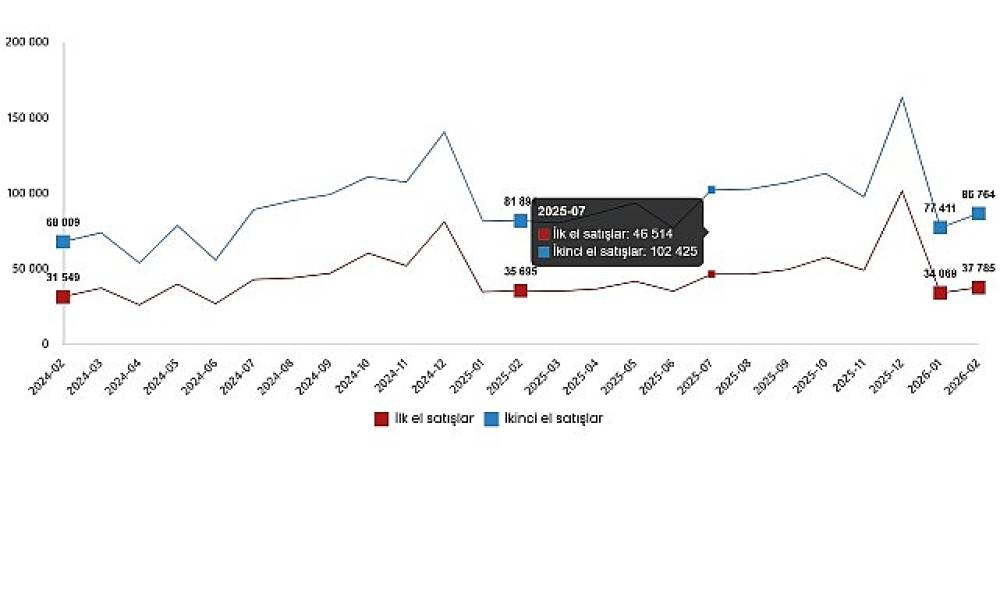Türkiye genelinde ilk el konut satış sayısı Şubat ayında bir önceki yılın aynı ayına göre %5,9 oranında artarak 37 bin 785 oldu. İkinci el konut satışları ise Şubat ayında bir önceki yılın aynı ayına göre %6,0 oranında artarak 86 bin 764 oldu. Toplam konut satışları içinde ilk el konut satışlarının payı %30,3, ikinci el konut satışlarının payı %69,7 oldu.